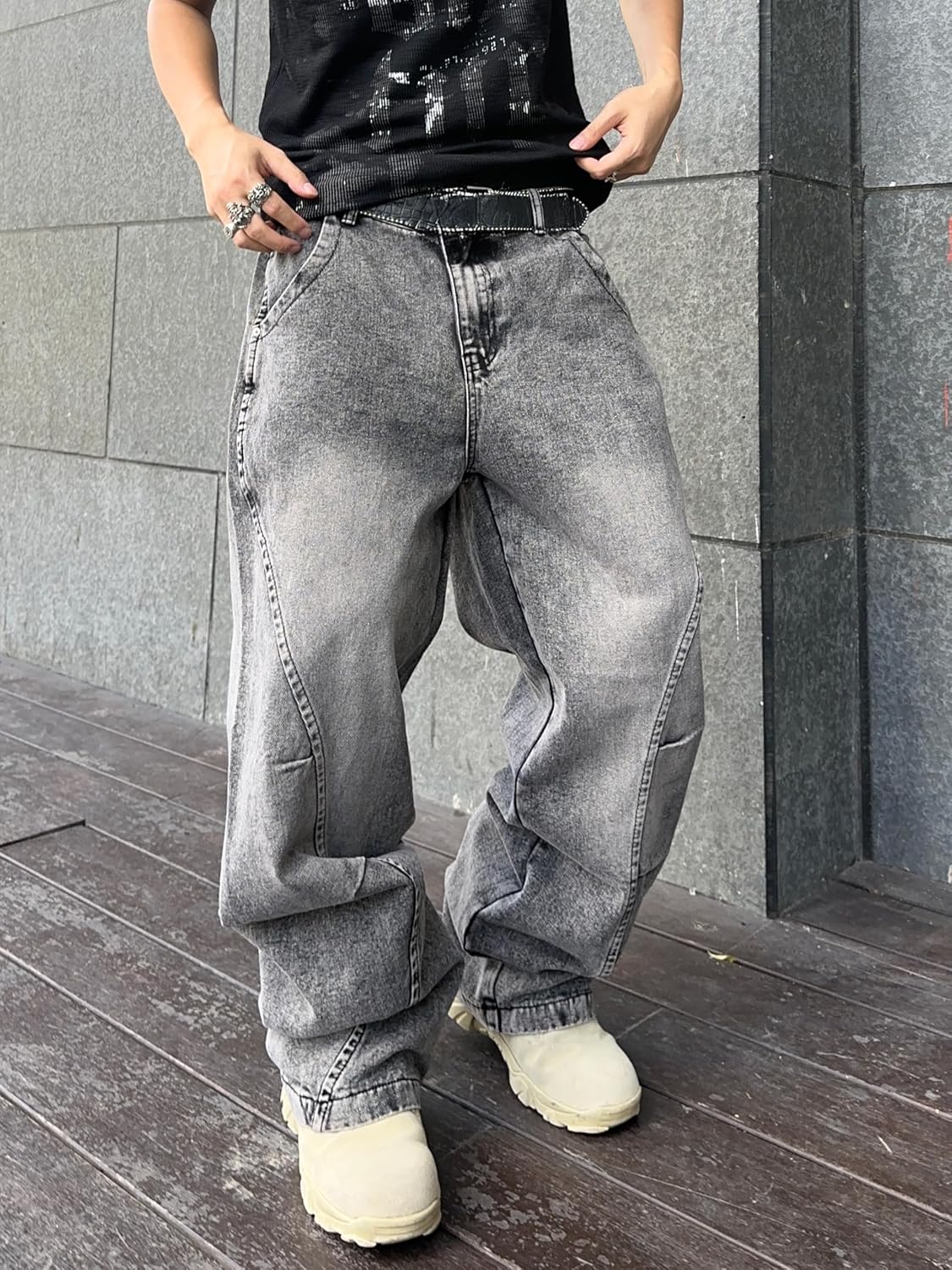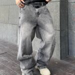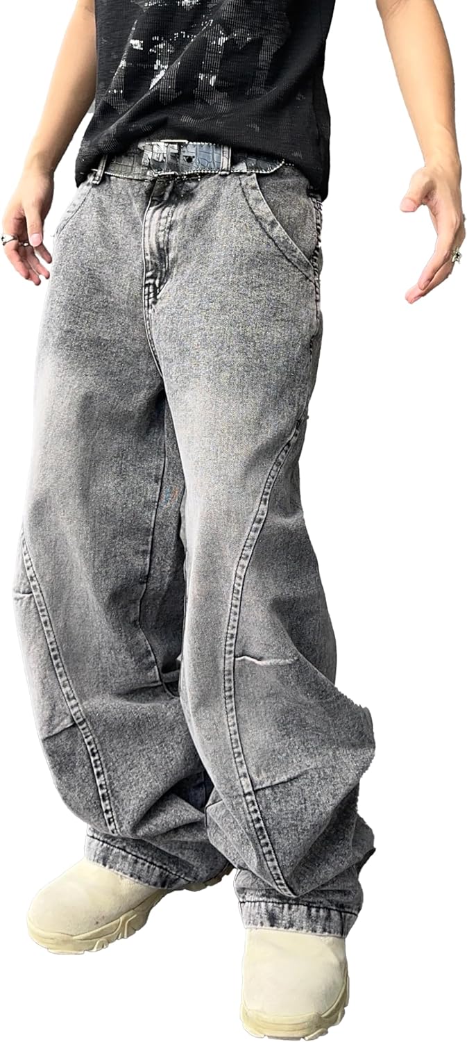 - hip hop-inspired baggy jeans with irregular sutures: Men’s Baggy Jeans draw inspiration from hip hop fashion and feature irregular sutures, adding a unique and edgy element to the design.